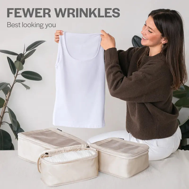 Finally, a smarter way to travel. Our Compression Packing Cubes transform the way you pack — giving you up to 50% more space, zero wrinkles, and effortless organization. No more digging through messy luggage or sitting on your suitcase to zip it shut. Just clean, compact order that makes every trip smoother from takeoff to unpacking.