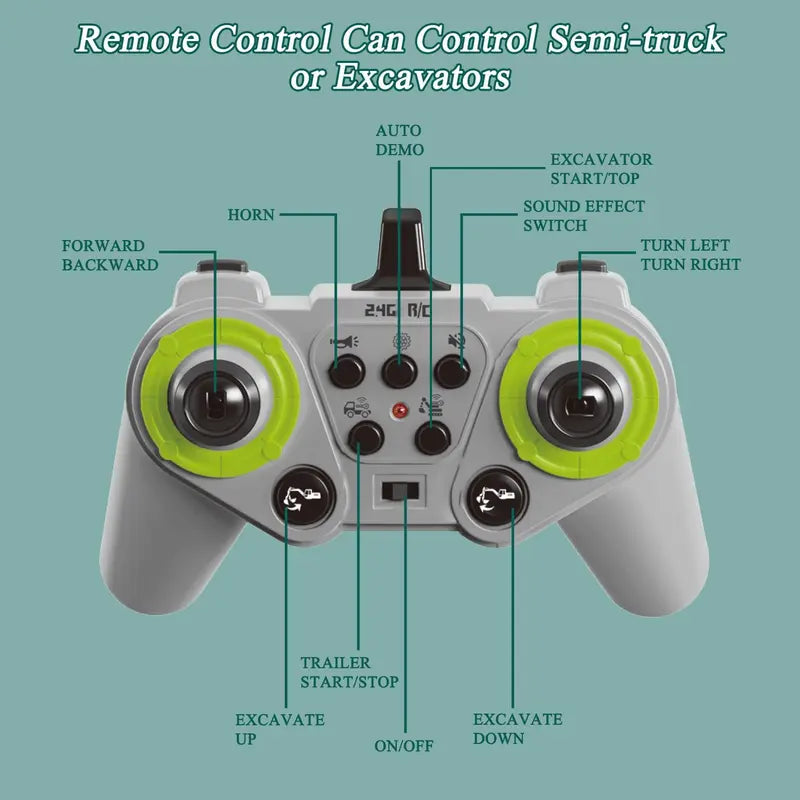 Operate both the semi-truck and excavator seamlessly with a single, easy-to-use controller. Every button is clearly labeled, letting kids control movement, lights, horn, and excavation functions like a real operator — giving them that thrilling “I’m in charge!” feeling every time they play.